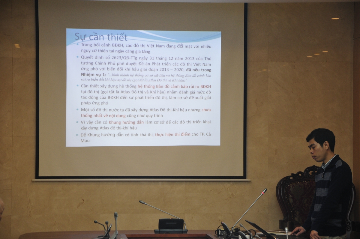 ThS. Nguyễn Huy Dũng – Phó Chủ nhiệm dự án trình bày nội dung nghiên cứu. Theo đó, mục tiêu dự án là xây dựng Khung hướng dẫn các đô thị xây dựng cơ sở dữ liệu, hình thành hệ thống bản đồ cảnh báo rủi ro do biến đổi khí hậu, nước biển dâng (Atlas đô thị - khí hậu) và xây dựng Atlas đô thị - khí hậu thí điểm cho 01 đô thị (thành phố Cà Mau, tỉnh Cà Mau). Sản phẩm nhiệm vụ gồm: Báo cáo tổng hợp xây dựng Khung hướng dẫn xây dựng Atlas đô thị - khí hậu; Dự thảo Khung hướng dẫn xây dựng Atlas đô thị-khí hậu cho các đô thị Việt Nam; Atlas Đô thị-Khí hậu thí điểm cho TP. Cà Mau và Bộ cơ sở dữ liệu phục vụ công tác quản lý của các đô thị chịu ảnh hưởng rủi ro do BĐKH và NBD