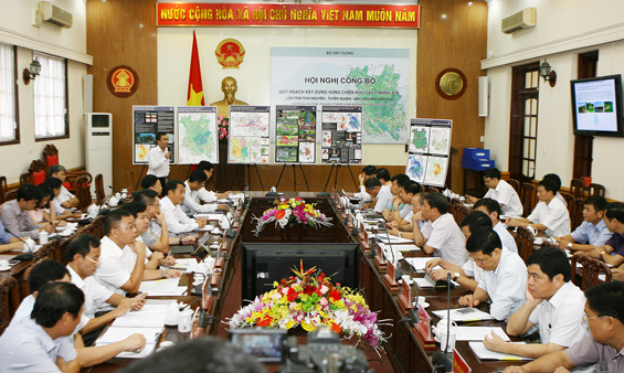 Đồng chí Nguyễn Đình Toàn, Thứ trưởng BXD trao hồ sơ quy hoạch cho đại diện lãnh đạo của 3 tỉnh trong vùng quy hoạch.