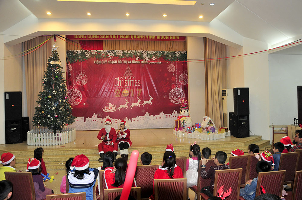 Quang cảnh của hội trường được các đoàn viên thanh niên VIUP chuẩn bị thật lộng lẫy, tỉ mỉ, công phu với cây thông lớn lung linh đầy sắc màu, người tuyết đáng yêu và nhiều món quà xinh xắn đã hứa hẹn sự thành công của đêm hội.