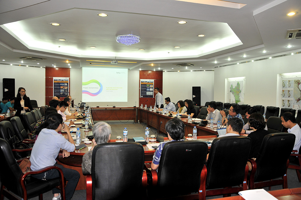 Tại Hội thảo, TS Eduard Voelker đã giới thiệu tổng quan chung về dự án Schwimmtour. Đây là tiểu dự án nằm trong chương trình “Xây dựng thành phố tương lai”do (được hỗ trợ bởi Bộ Giáo dục và Nghiên cứu Đức). Chương trình này gồm 10 dự án ở khắp nơi trên nước Đức. Trong đó, 9 dự án liên quan tới quy hoạch đô thị, quy hoạch nông thôn, hạ tầng cơ sở… Dự án này liên quan tới vấn đề nhà nổi. Dự án hướng tới việc cung cấp và chuyển giao những kiến thức, kỹ thuật xây dựng nhà nổi từ châu Âu tới Việt Nam; trao đổi kinh nghiệm của các chuyên gia trong lĩnh vực nghiên cứu kiến trúc nhà nổi, đề xuất mô hình nhà nổi bền vững – Đó là mô hình nhà nổi có thể tự cung tự cấp bằng cách sử dụng năng lượng thay thế, tự cung tự cấp nước uống, sử dụng tái chế chất thải cũng như tối ưu hoá vật liệu và kết cấu của ngôi nhà. Qua dự án này, ông mong muốn kết nối các đối tượng quan tâm, cùng thực hiện và phát triển kết quả nghiên cứu này.