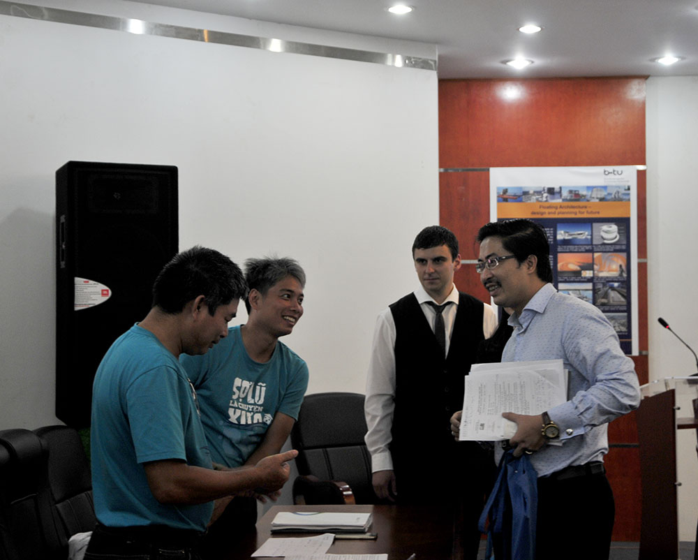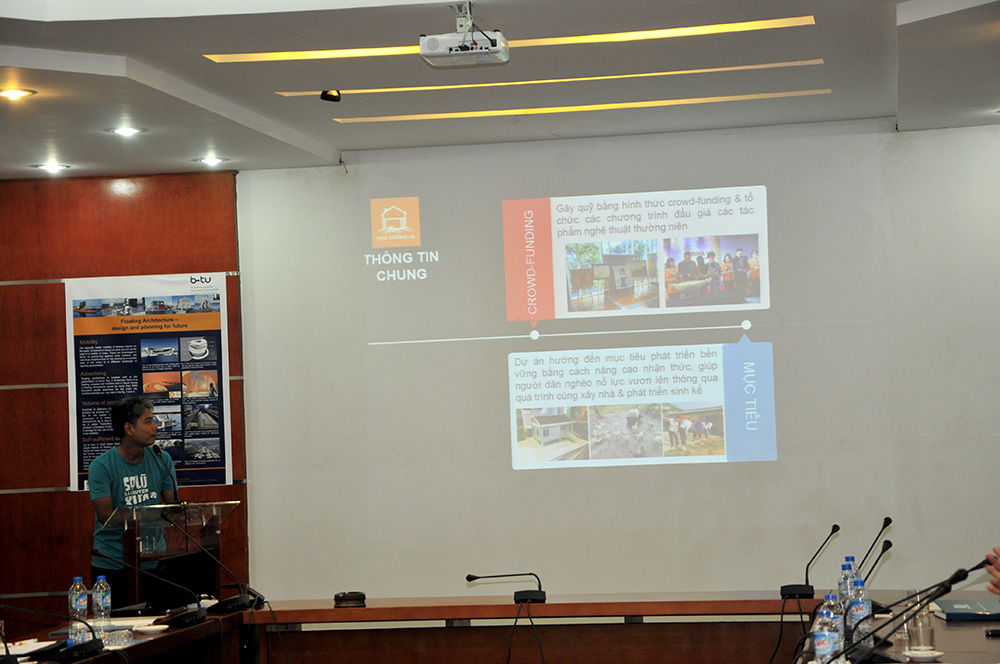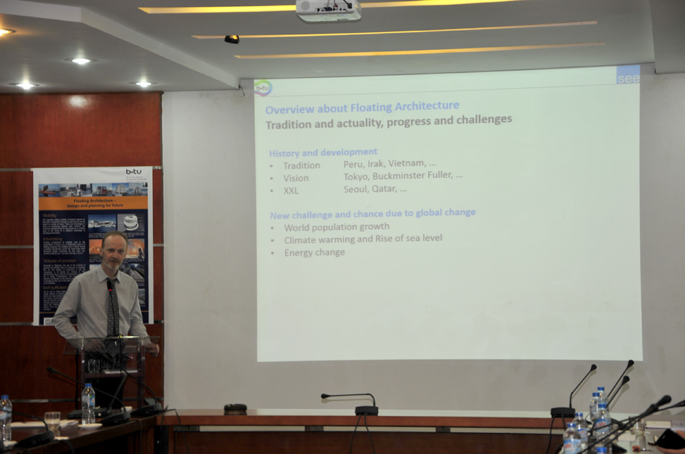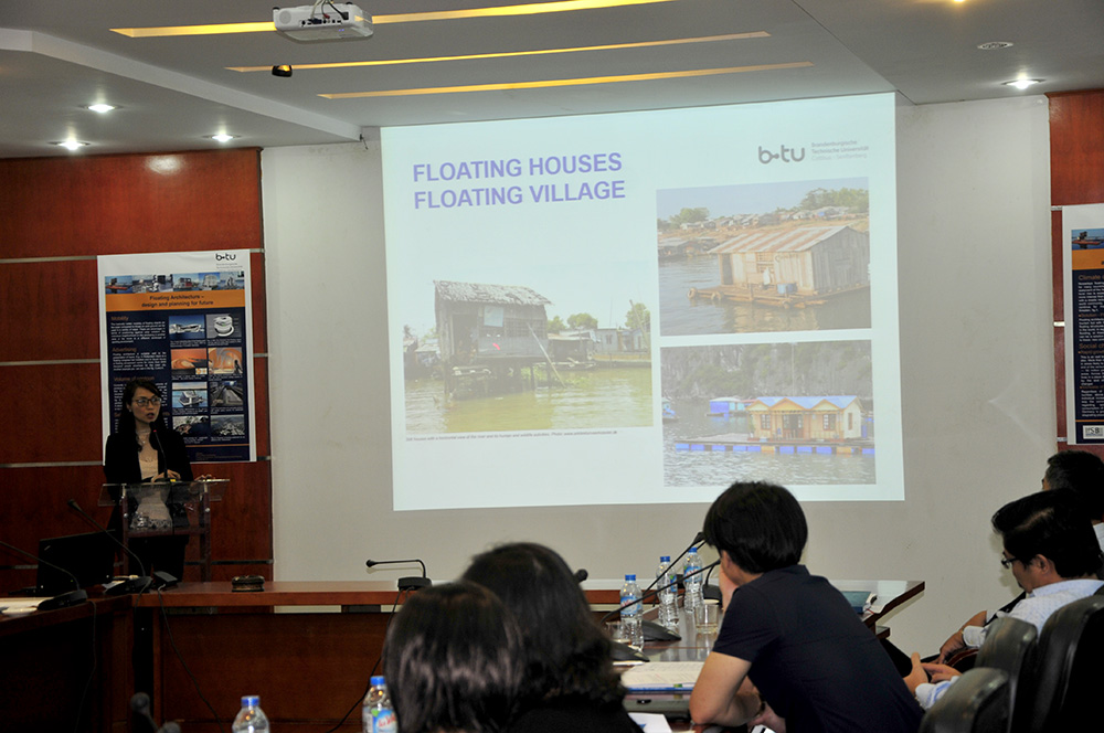 Tiếp đó, ông Karsten Feucht đã giới thiệu về kiến trúc nhà nổi, quá trình phát triển và thách thức, những kỹ thuật trong xây dựng nhà nổi, đưa ra ví dụ về kiến trúc nhà nổi ở khu vực vùng đất mới ven hồ Lusatia, CHLB Đức. Ngoài ra, bà Nguyễn Thu Trang trình bày về nhà nổi, làng nổi tại Việt Nam và ông Đinh Bá Vinh thuộc dự án Nhà ở chống lũ đã giới thiệu dự án nhà ở chống lũ triển khai ở miền Trung Việt Nam thời gian vừa qua.