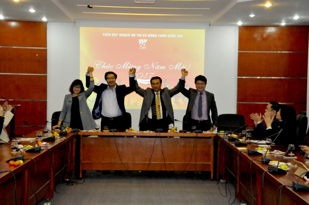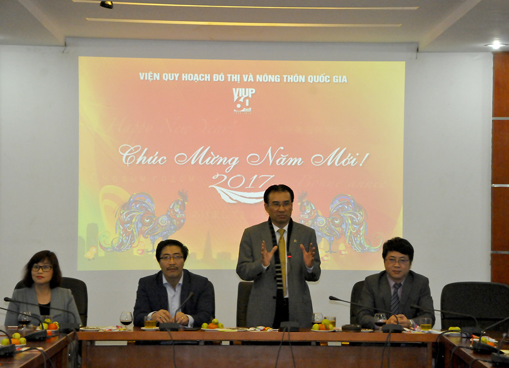 Nhân dịp này, đồng chí Ngô Trung Hải, Viện trưởng đã chia sẻ một số điều về những thành tích Viện đạt được trong năm 2016. Ông cho rằng năm 2016 đánh dấu 60 năm VIUP hình thành và phát triển. Viện đã tổ chức thành công buổi lễ 60 năm trang trọng cùng với nhiều hoạt động như hội thảo khoa học, hội diễn văn nghệ và hội thao và nhận được nhiều khen ngợi từ chính phủ, các bộ, ngành.. Viện đã hoàn thành tốt nhiều công trình quan trọng của trung ương và của Bộ giao và tiếp tục thực hiện quy hoạch trụ sở các Bộ ngành tại khu vực Mễ Trì và Tây Hồ Tây. Năm mới Đinh Dậu, ông hy vọng các đơn vị sẽ đổi mới cách làm, Viện sẽ tổ chức cho các KTS, nhà quy hoạch trong Viện đóng góp ý tưởng cho đồ án này để làm cho tốt, đúng đẳng cấp, tầm cỡ của Viện đầu ngành. Bên cạnh đó, Viện sẽ tiếp tục gánh vác những đồ án lớn của quốc gia như tham gia vào cuộc thi tuyển ý tưởng phương án tổ chức giao thông và các giải pháp chống ùn tắc giao thông trên địa bàn thành phố Hà Nội đến năm 2025, tầm nhìn đến năm 2030 do Sở GTVT Hà Nội tổ chức. Viện sẽ tổ chức hội thảo chuyên gia trong viện để phát huy trí tuệ cho cuộc thi này. Ông cho biết, năm tới Viện sẽ tổ chức buổi gặp gỡ du Xuân dã ngoại cho toàn thể cán bộ của Viện.