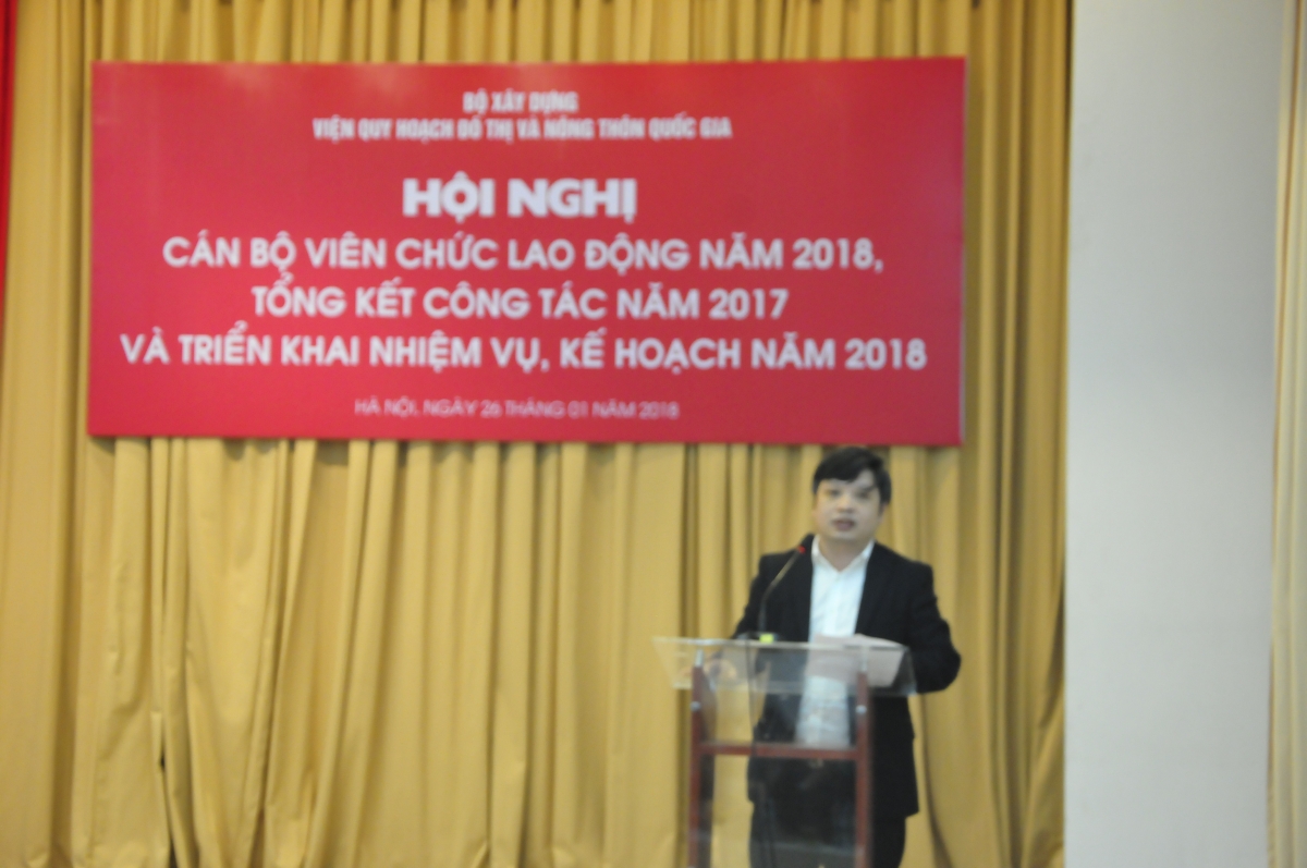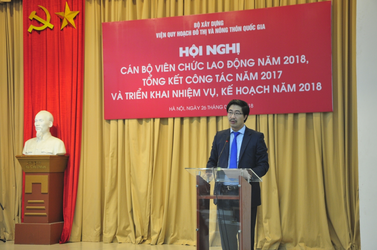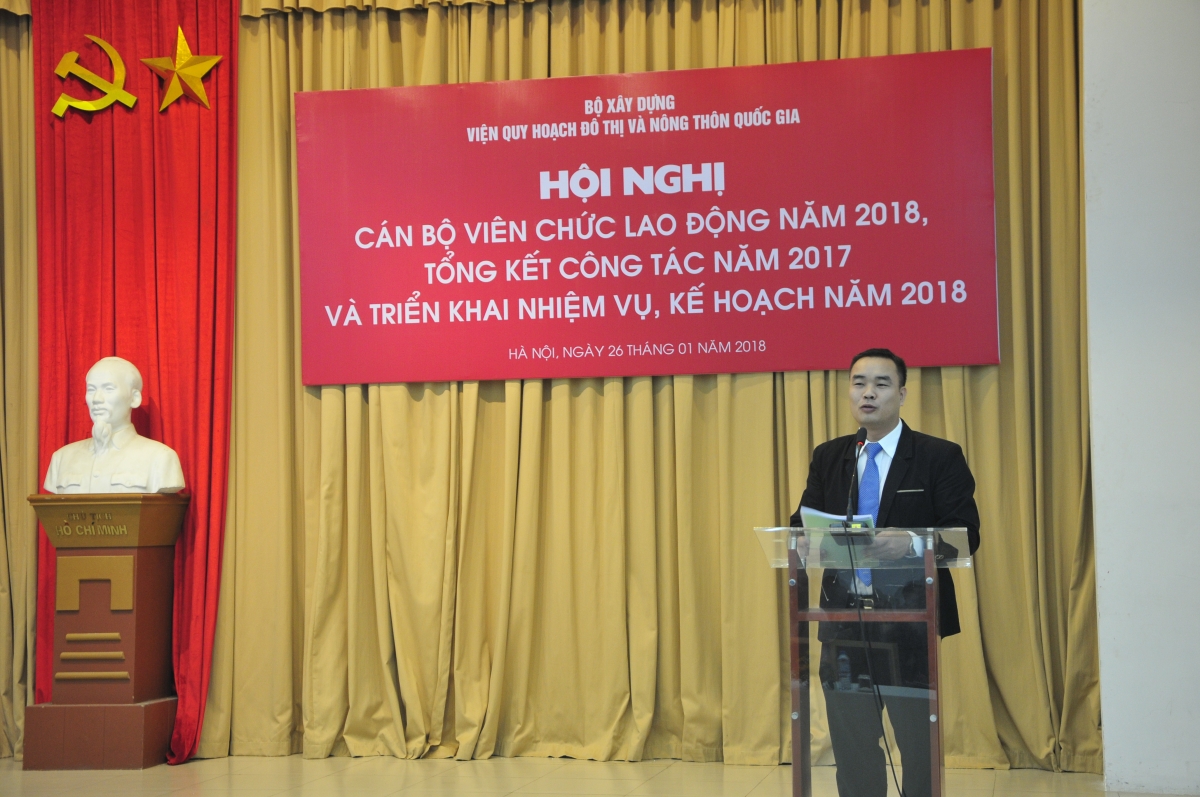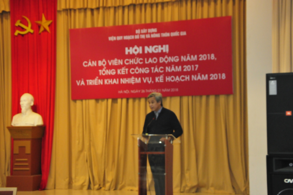 Thay mặt cán bộ Viện, Q. Viện trưởng Lưu Đức Cường đã báo cáo tình hình thực hiện nhiệm vụ kế hoạch năm 2017 và phương hướng nhiệm vụ trọng tâm năm 2018. Báo cáo tập trung vào công tác phục vụ quản lý nhà nước trong lĩnh vực quy hoạch, kiến trúc; Công tác nghiên cứu khoa học; Công tác tư vấn quy hoạch, kiến trúc thuộc chức năng nhiệm vụ của Viện; Công tác điều hành quản lý Viện; Công tác Đảng, công tác đoàn thể; Hoạt động của các hội nghề nghiệp.
