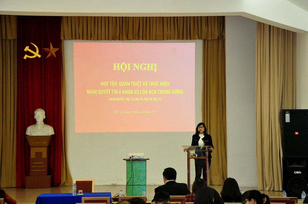 Phát biểu khai mạc hội nghị, Phó Viện trưởng VIUP Phạm Thị Thanh Hoa cho biết đây là đợt sinh hoạt chính trị cho cả đảng viên 3 đảng bộ. 4 Nghị quyết quan trọng của Hội nghị lần thứ 6 Ban Chấp hành Trung ương Đảng, khóa XII sẽ được TS Đỗ Việt Hà, Giám đốc Trung tâm Bồi dưỡng chính trị đảng ủy khối các cơ quan trung ương trình bày. Các nghị quyết đó bao gồm: Nghị quyết số 18-NQ/TW “Một số vấn đề về tiếp tục đổi mới, sắp xếp tổ chức bộ máy của hệ thống chính trị tinh gọn, hoạt động hiệu lực, hiệu quả”; Nghị quyết số 19-NQ/TW “Về tiếp tục đổi mới hệ thống tổ chức và quản lý, nâng cao chất lượng và hiệu quả hoạt động của các đơn vị sự nghiệp công lập”; Nghị quyết số 20-NQ/TW “Về tăng cường công tác bảo vệ, chăm sóc và nâng cao sức khỏe nhân dân trong tình hình mới”; Nghị quyết số 21-NQ/TW “Về công tác dân số trong tình hình mới”.