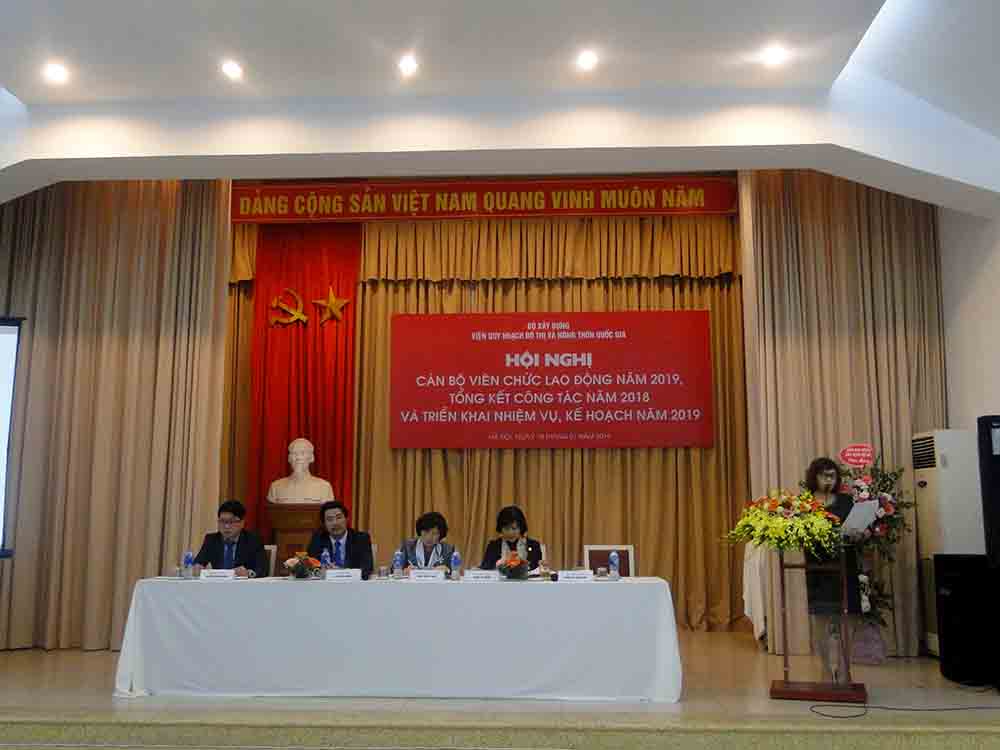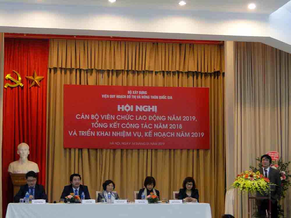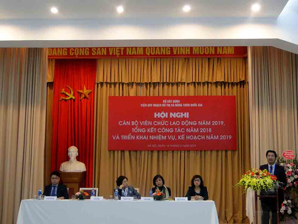 Thay mặt cán bộ Viện, Phó Viện trưởng Phạm Thị Thanh Hoa đã báo cáo tình hình thực hiện nhiệm vụ kế hoạch năm 2018 và phương hướng nhiệm vụ trọng tâm năm 2019. Báo cáo tập trung vào công tác phục vụ quản lý nhà nước trong lĩnh vực quy hoạch, kiến trúc; Công tác nghiên cứu khoa học; Công tác tư vấn quy hoạch, kiến trúc thuộc chức năng nhiệm vụ của Viện; Công tác điều hành quản lý Viện; Công tác Đảng, công tác đoàn thể; Hoạt động của các hội nghề nghiệp.