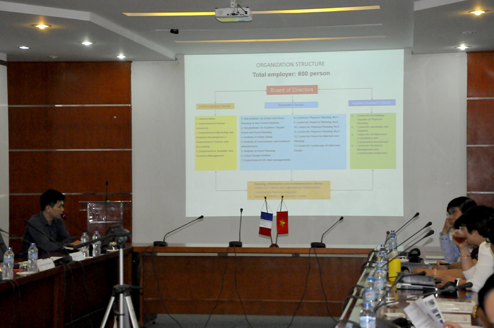 Để giúp các KTS Pháp hiểu sơ qua về VIUP, Chánh Văn phòng Nguyễn Tấn Trúc đã trình bày tóm tắt chức năng nhiệm vụ, cơ cấu tổ chức và những công trình đoạt giải trong những năm gần đây của Viện.