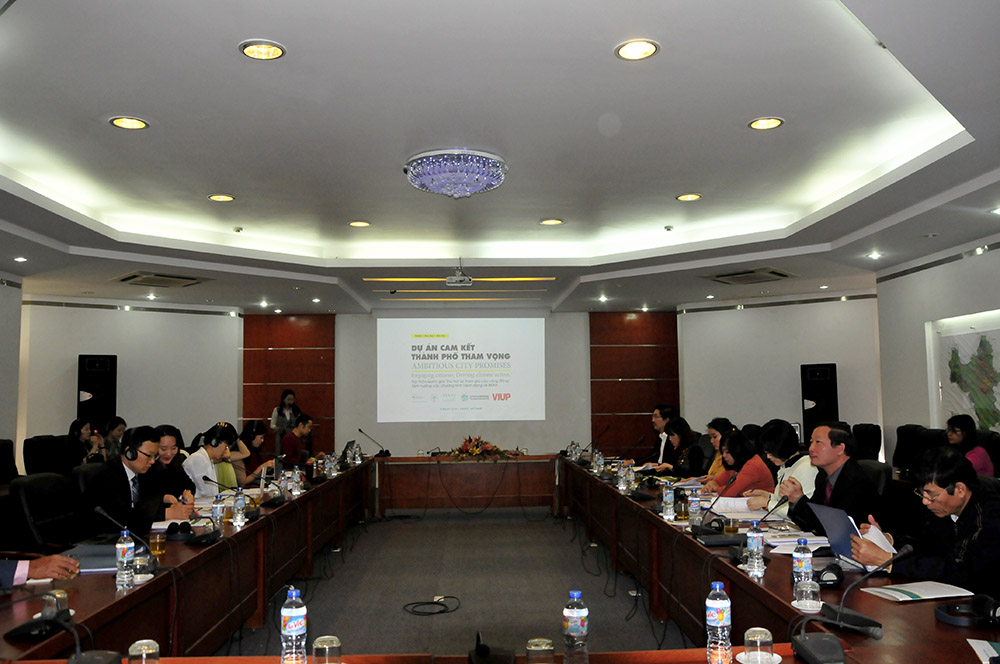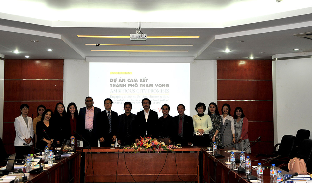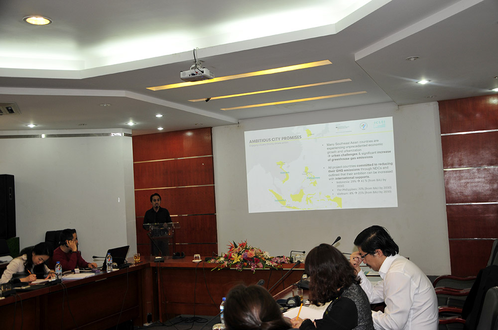 Tiếp đó ông Ranell Martin Dedicatoria - ban thư ký thế giới ICLEI đã giới thiệu tổng quan dự án này. Theo đó, dự án “Cam kết thành phố tham vọng” do ICLEI tổ chức thực hiện dưới sự tài trợ của BMUB (Bộ Tài nguyên môi trường, xây dựng và an toàn hạt nhân liên bang Đức). Thời gian thực hiện dự án từ tháng 7/2017- 6/2020. Dự án này thực hiện với mục tiêu kêu gọi các thành phố lớn ở Đông Nam Á (bước đầu là 3 quốc gia: Philippines, Indonesia và Việt Nam) tham gia cam kết về việc “cắt giảm lượng khí thải nhà kính” và hỗ trợ các đô thị này nghiên cứu thành lập các chương trình hành động cụ thể. Đồng thời dự án này cũng mong muốn tăng cường vai trò, sự tham gia của các cấp chính quyền từ Trung ương đến địa phương trong việc ứng phó với BĐKH.
