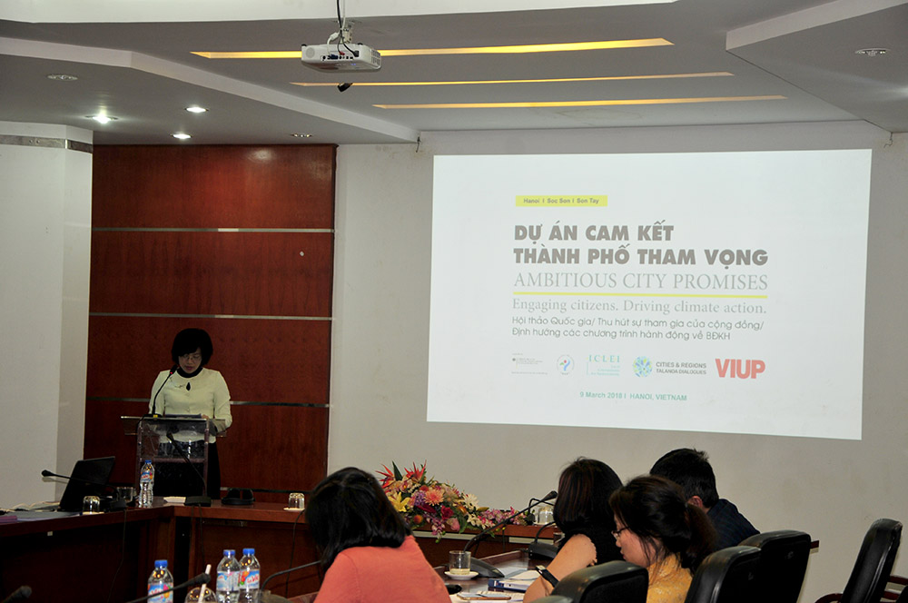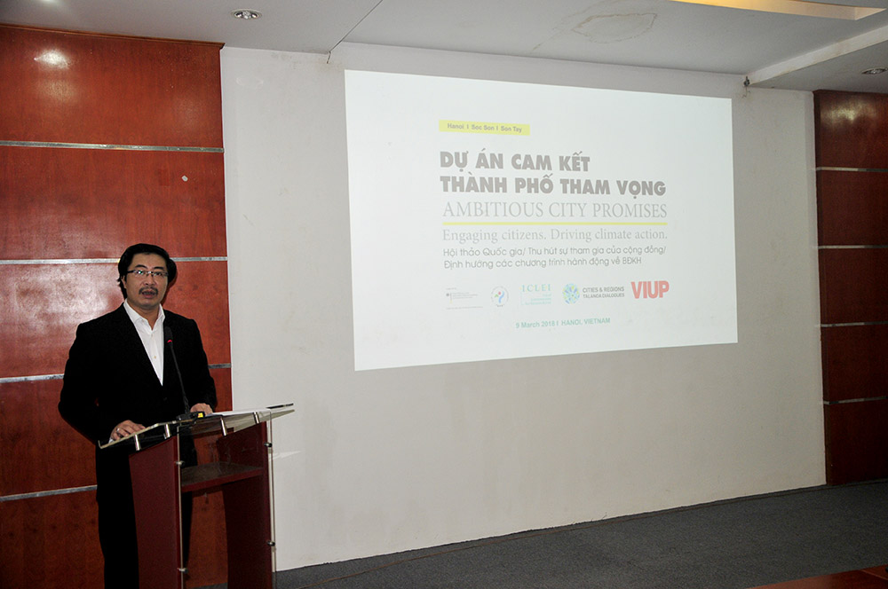 Phát biểu khai mạc hội thảo, PGS.TS.KTS Lưu Đức Cường cho biết vấn đề BĐKH trong thời gian gần đây đang trở nên khắc nghiệt và bất thường, hạn hán, ngập lụt, sạt lở, dông bão diễn ra có xu hướng ngày càng phức tạp và ảnh hưởng nghiêm trọng tới kinh tế và đời sống người dân. Việt Nam được các tổ chức quốc tế đánh giá là 1 trong 3 hoặc 5 quốc gia chịu ảnh hưởng nặng nề nhất của tác động BĐKH tùy vào từng tiêu chí. Việt Nam là một trong những quốc gia sớm phê chuẩn Công ước về BĐKH, nghị định thư Kyoto. Trong những năm qua, Việt Nam có nhiều nỗ lực trong việc triển khai các biện pháp giảm nhẹ phát thải khí nhà kính và sẵn sàng ứng phó với BĐKH, thể hiện qua các chương trình, kế hoạch hành động ứng phó với tác động BĐKH ở các địa phương. Dự án Cam kết thành phố tham vọng do ICLEI triển khai thực hiện ở Việt Nam từ tháng 7/2017. VIUP và ICLEI đã ký kết thỏa thuận hợp tác, trong đó, VIUP đóng vai trò hướng dẫn, chỉ đạo thực hiện dự án phù hợp với các quy định, chính sách của Việt Nam. Việt Nam chọn Hà Nội - Một trong những đô thị lớn của Đông Nam Á, với tốc độ đô thị hóa cao và đang phải đối mặt với nhiều vấn đề như hệ thống cơ sở hạ tầng quá tải, ô nhiễm môi trường và các ảnh hưởng của BĐKH và hai đô thị vệ tinh là Sơn Tây và Sóc Sơn (là nơi có chính sách ổn định và kết nối tốt nhất với Hà Nội) tham gia vào dự án. Ông cho rằng, giải quyết các vấn đề môi trường hiện nay là một việc vô cùng quan trọng, là xu hướng toàn cầu đòi hỏi sự chung tay hành động của tất cả các quốc gia, các đô thị, từng người dân sự phối hợp giữa các cơ quan cấp trung ương và chính quyền địa phương, các bộ ngành. Viện trưởng VIUP hy vọng dự án sẽ đóng góp một phần vào công cuộc ứng phó với BĐKH của thế giới cũng như của Việt Nam.