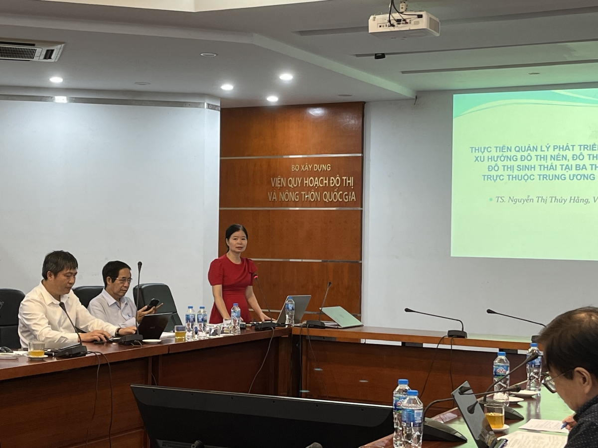 TS. Nguyễn Thị Thúy Hằng- chủ nhiệm đề tài trình bày tham luận phân tích thực tiễn quản lý phát triển đô thị theo 3 xu hướng chủ đạo là đô thị nén, đô thị tập trung, đô thị sinh thái (đô thị tích hợp 3 xu hướng -E3C) tại 3 đô thị lớn của Việt Nam gồm Hà Nội, Đà Nẵng và TP. Hồ Chí Minh. Nghiên cứu đã rút ra một số bài học kinh nghiệm và đề xuất một số khuyến nghị về hoàn thiện thể chế, chính sách; nâng cao năng lực quản lý và ứng dụng chuyển đổi số; phát triển đồng bộ hạ tầng giao thông công cộng và hạ tầng xanh; huy động nguồn lực xã hội hóa và công nghệ mới; thúc đẩy sự tham gia của cộng đồng và các bên liên quan; xây dụng và áp dụng bộ chỉ số đánh giá hiệu quả quản lý phát triển đô thị theo E3C.