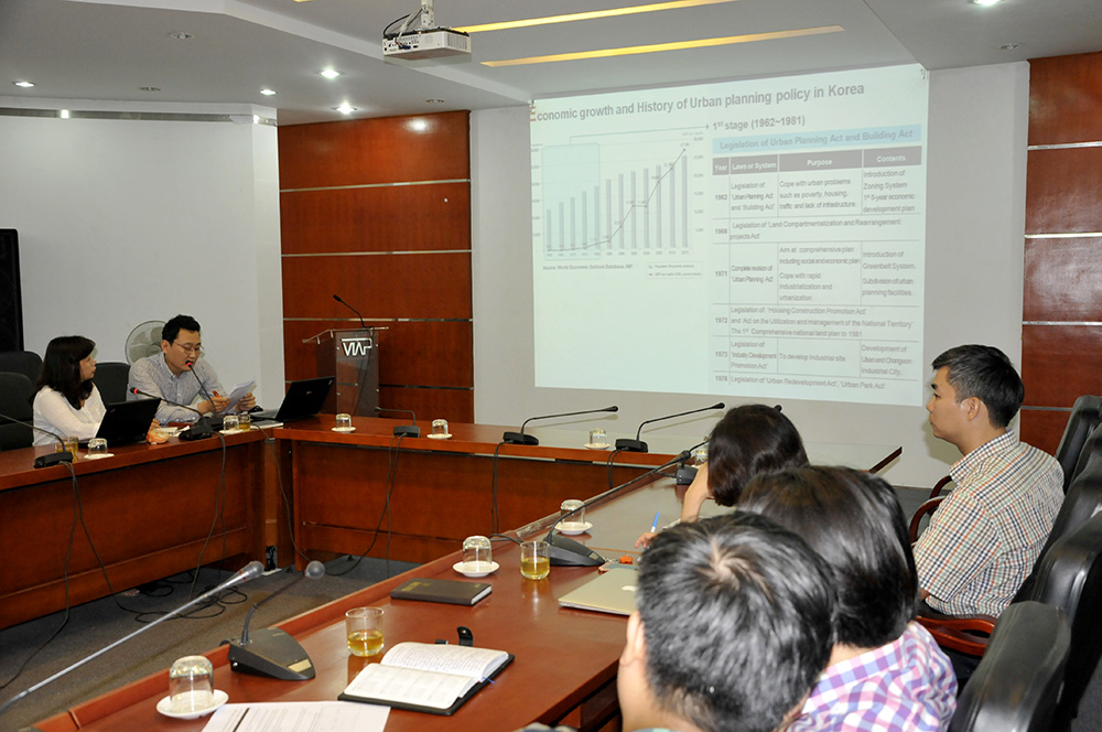 Tiếp đó, thực tập sinh Hàn Quốc Jeon Sang – Sik đã trình bày về hệ thống quy hoạch đô thị ở Hàn Quốc. Nội dung đi sâu vào tăng trưởng kinh tế và lịch sử của chính sách quy hoạch đô thị, phát triển đô thị và thay đổi về đơn vị hành chính, hệ thống quy hoạch đô thị, các loại hình quy hoạch đô thị và lịch sử phát triển đô thị ở Hàn Quốc.