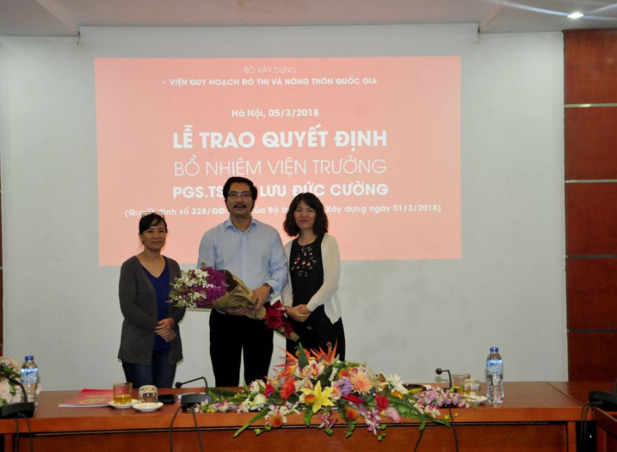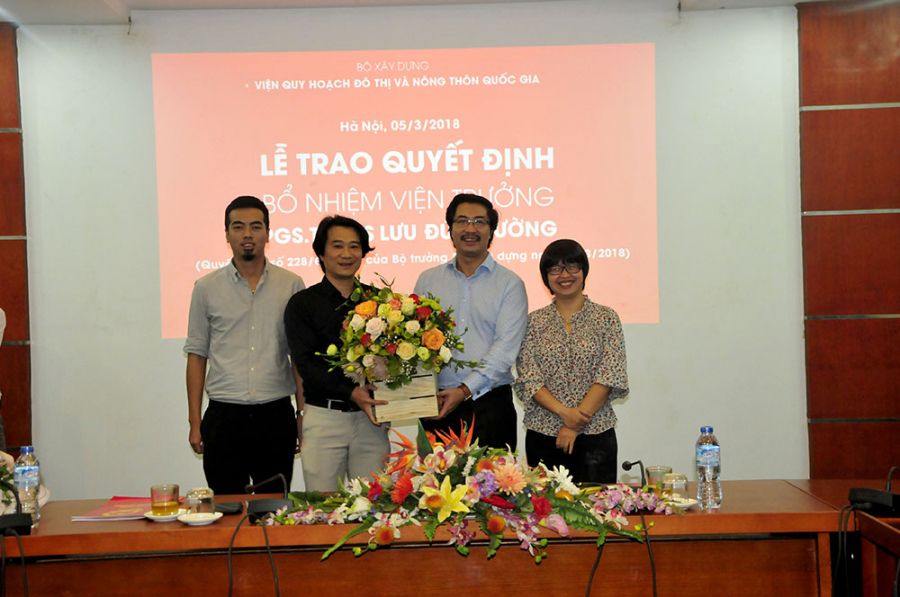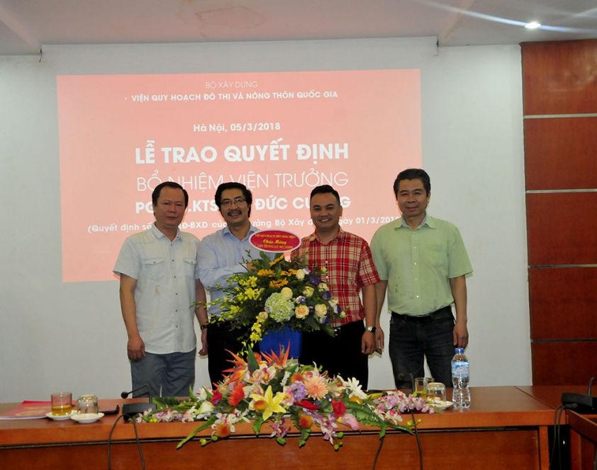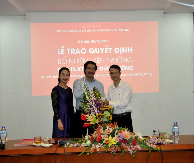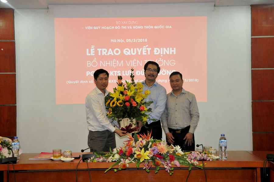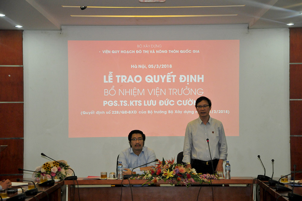 Thay mặt Ban cán sự Đảng, lãnh đạo Bộ Xây dựng, Thứ trưởng Nguyễn Đình Toàn trao quyết định và chúc mừng PGS.TS.KTS Lưu Đức Cường – Quyền Viện trưởng VIUP nhân dịp được bổ nhiệm chính thức chức vụ Viện trưởng.