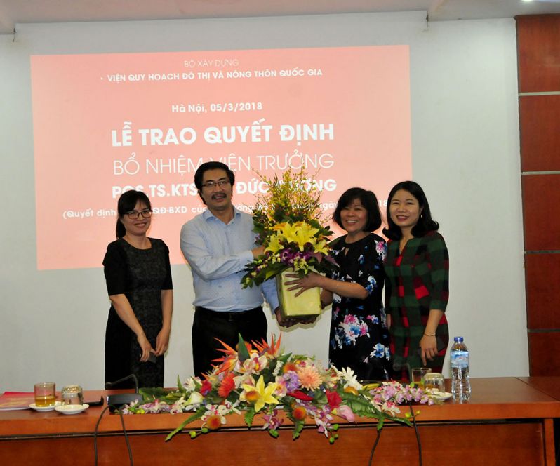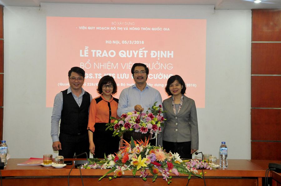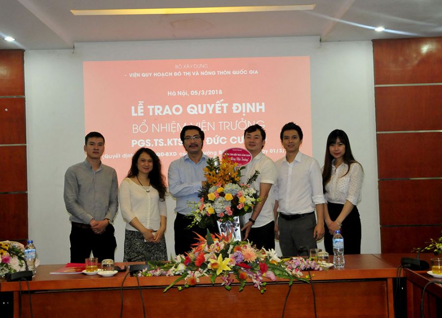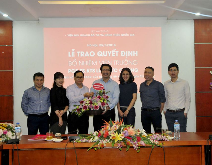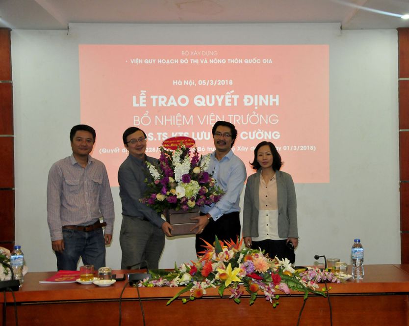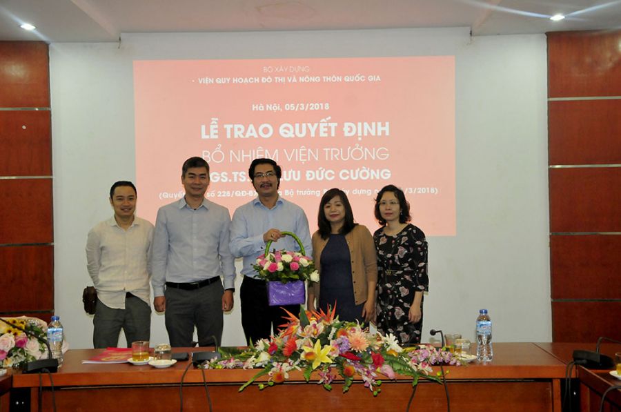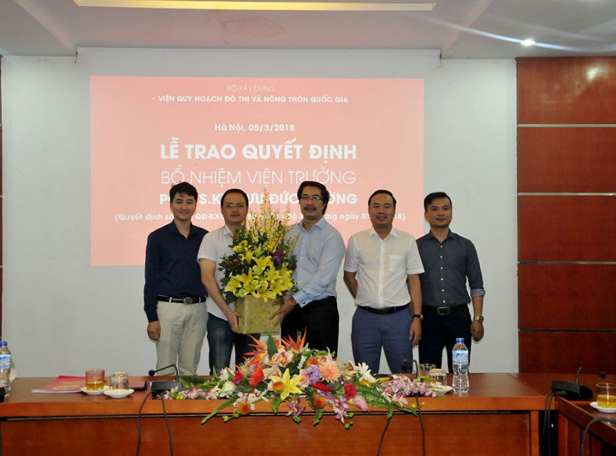 Thay mặt Ban cán sự Đảng, lãnh đạo Bộ Xây dựng, Thứ trưởng Nguyễn Đình Toàn trao quyết định và chúc mừng PGS.TS.KTS Lưu Đức Cường – Quyền Viện trưởng VIUP nhân dịp được bổ nhiệm chính thức chức vụ Viện trưởng.