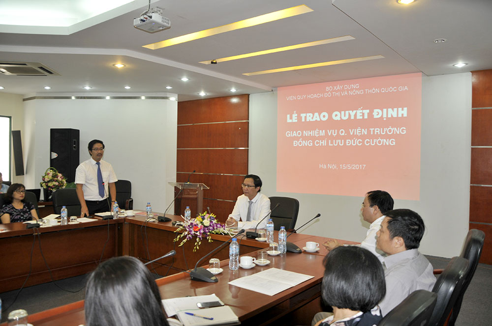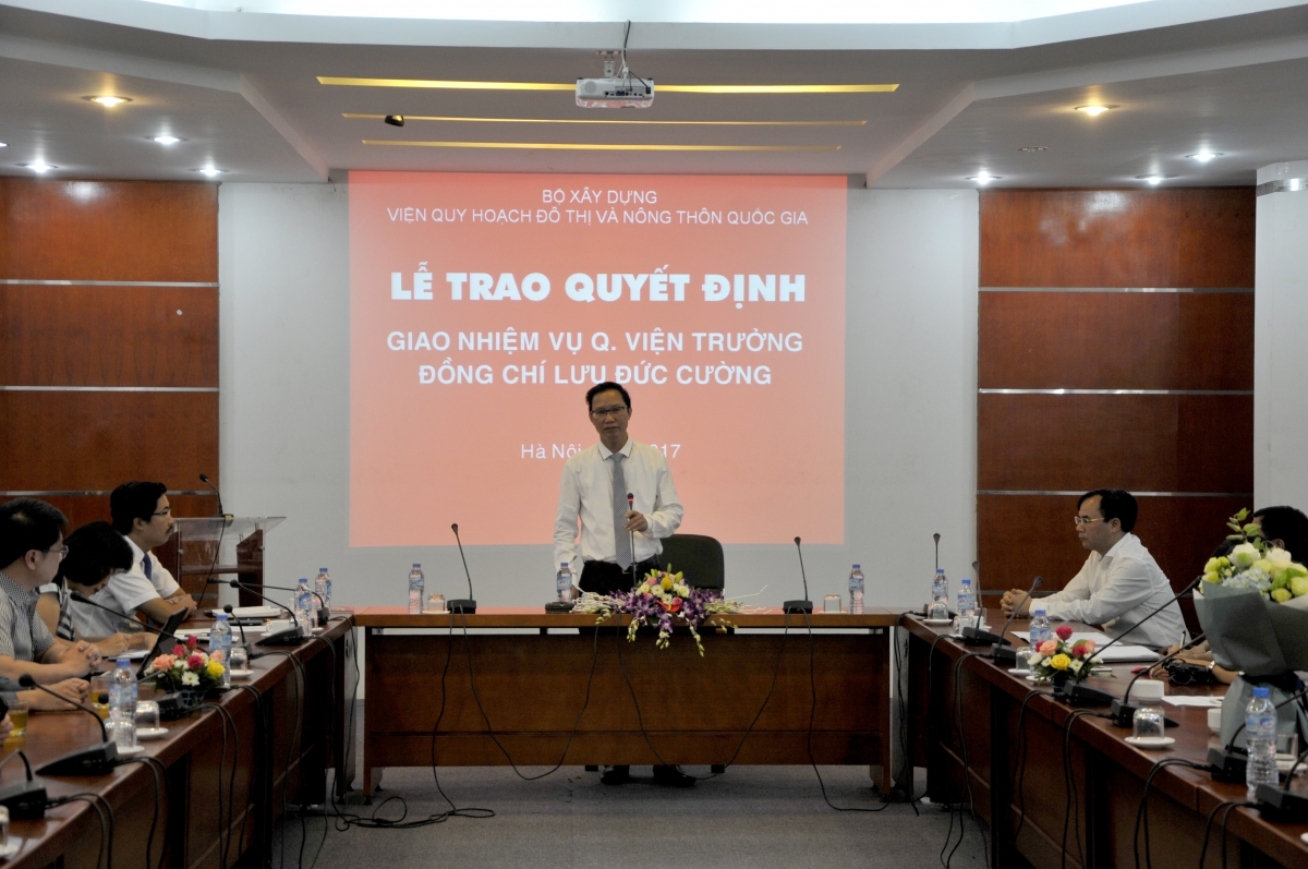 Phát biểu tại buổi lễ, Quyền Viện trưởng Lưu Đức Cường bày tỏ sự biết ơn sâu sắc tới các đồng chí lãnh đạo Bộ Xây dựng đã tin tưởng trao trọng trách điều hành Viện, cũng như toàn thể cán bộ, đồng nghiệp đã tín nhiệm. Quyền Viện trưởng cho rằng đây là giai đoạn thử thách của cá nhân để từng bước hoàn thiện mình, chứng minh năng lực bản thân. Quyền Viện trưởng đặt ra 2 mục tiêu là xây dựng Viện thực sự vững mạnh về mọi mặt và chăm lo đời sống của cán bộ. Trước mắt, ông đề ra 3 nhiệm vụ cấp bách cần triển khai: