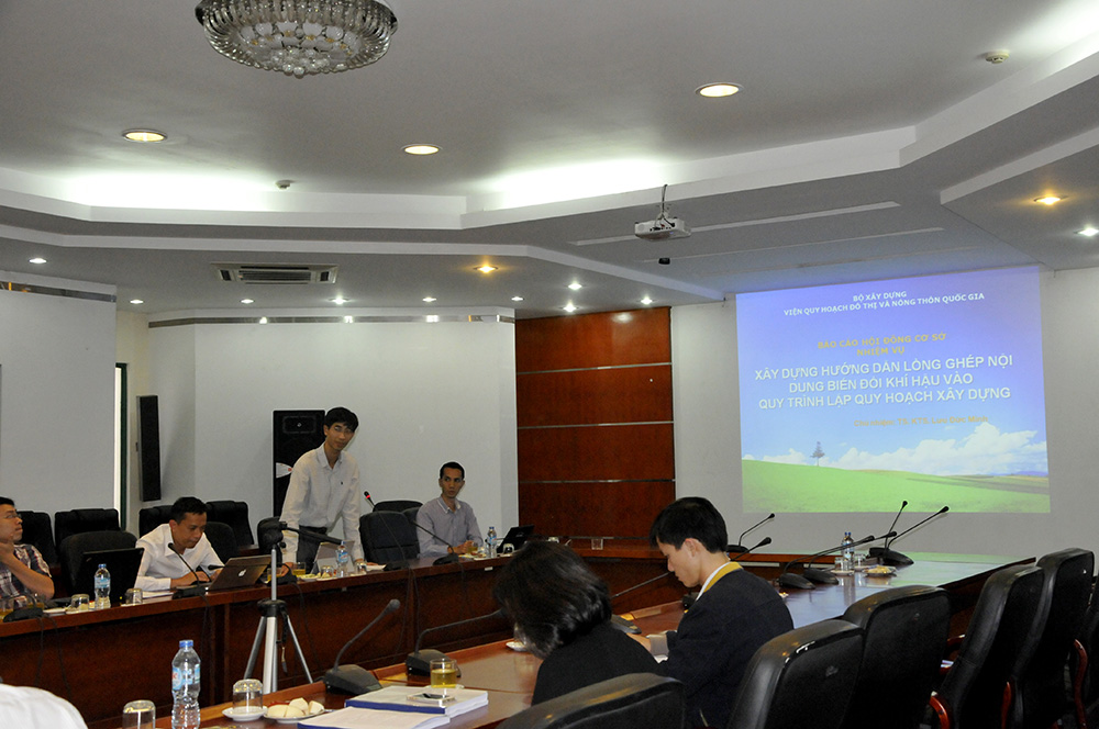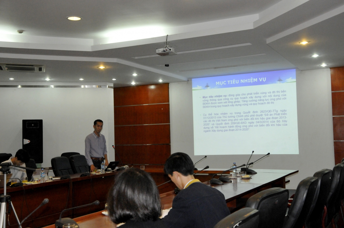 Tiếp đó, ThS. Nguyễn Việt Dũng thay mặt nhóm nghiên cứu trình bày nội dung nghiên cứu. Mục tiêu của nhiệm vụ nhằm đóng góp cho phát triển vùng và đô thị bền vững thông qua công cụ quy hoạch xây dựng với nội dung của BĐKH được xem xét lồng ghép. Tăng cường năng lực ứng phó với BĐKH trong QHXD vùng và QHĐT.