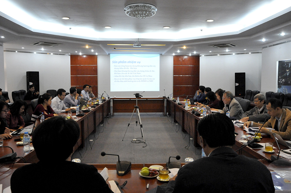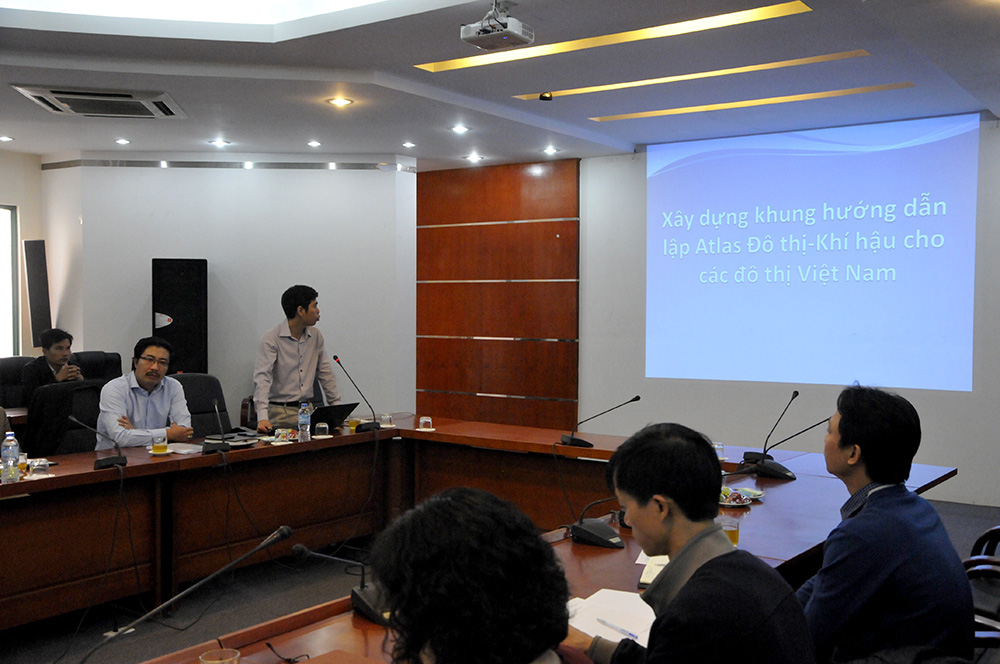 Tại cuộc họp, PGS.TS.KTS Lưu Đức Cường – Chủ nhiệm dự án đã sơ qua đôi nét về nhiệm vụ như sự cần thiết, ý nghĩa, mục tiêu của Atlas, những nội dung đã triển khai, sản phẩm của nhiệm vụ. Tiếp đó, ThS. Nguyễn Huy Dũng thay mặt nhóm nghiên cứu trình bày nội dung nghiên cứu. Mục đích của khung hướng dẫn các đơn vị chức năng lập Atlas đô thị - khí hậu cho các đô thị tại Việt Nam; Là tài liệu kỹ thuật cho công tác chuyên môn ở địa phương trong việc lập Atlas; Là tài liệu tham khảo cho các nhà quản lý trong việc thẩm định, ra quyết định về các vấn đề liên quan đến xây dựng bản đồ cảnh báo rủi ro đô thị; Là tài liệu tham khảo cho các nhà QHĐT trong việc xây dựng cơ sở dữ liệu, lập bản đồ liên quan đến rủi ro thiên tai.