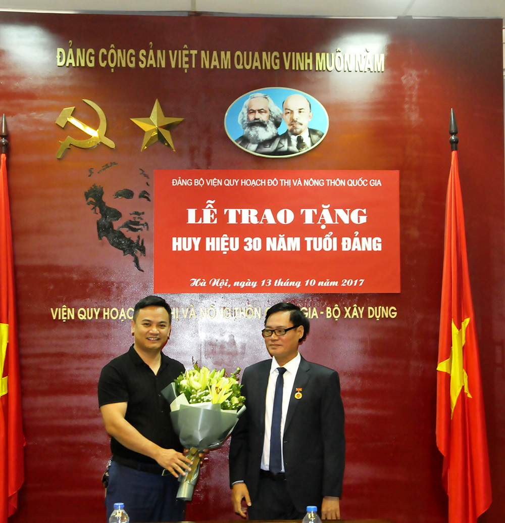 Đồng chí Lưu Đức Cường thay mặt Đảng ủy VIUP trao huy chương 30 năm tuổi Đảng cho đồng chí Phạm Dương Tiếp. Ông cho biết tới nay VIUP có 3 đồng chí được trao Huy hiệu 30 năm tuổi Đảng. Đây là vinh dự đối với đảng ủy Viện, chi bộ Viện QHXD và chính đồng chí Tiếp. Đồng chí Tiếp là cán bộ lâu năm của Viện, trải qua nhiều năm lăn lộn với nghề và đã có những đóng góp vào sự thành công của VIUP. Ông chúc mừng đồng chí Phạm Dương Tiếp và mong rằng đồng chí Tiếp phát huy tốt vai trò gương mẫu của mình trong mọi hoạt động của đơn vị và của Viện.