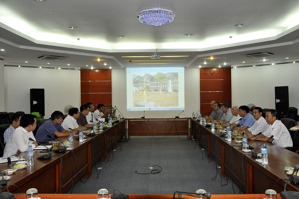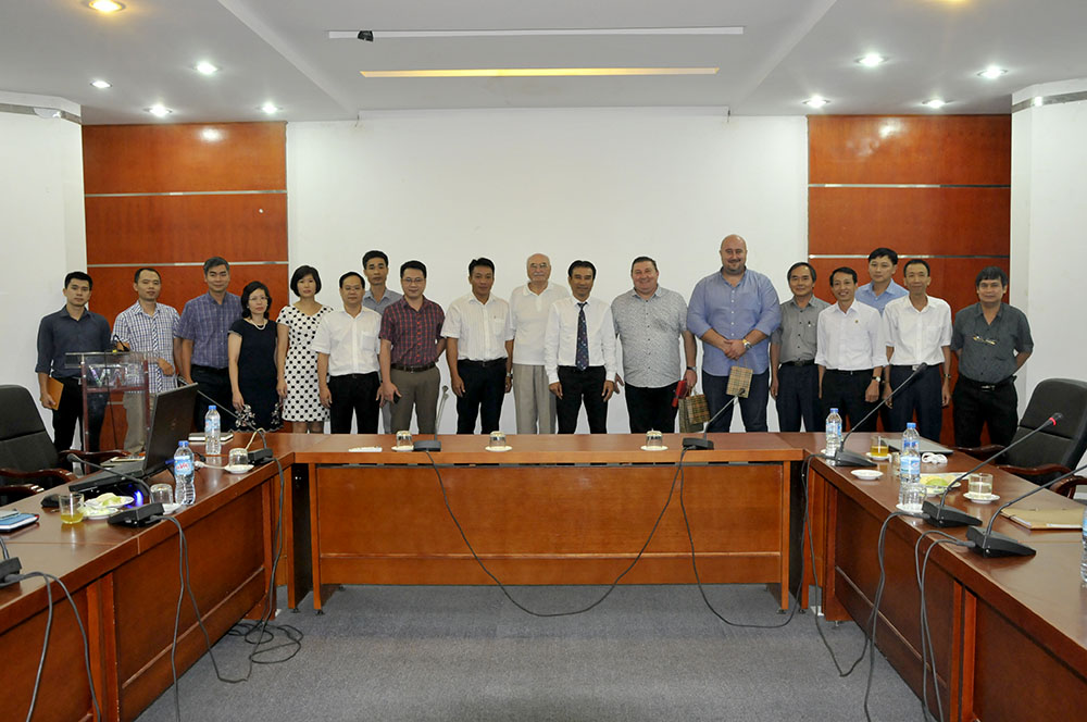 Viện trưởng Ngô Trung Hải (ở giữa) chào mừng lãnh đạo công ty Geodezia tới thăm Viện và giới thiệu công việc triển khai liên quan tới lĩnh vực trắc địa và bản đồ