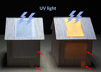 Khi tiếp xúc với ánh sáng tia cực tím bên ngoài, tấm gỗ phát quang (bên phải) sẽ thắp sáng không gian trong ngôi nhà đồ chơi, trong khi tấm không phát quang (bên trái) thì không. Ảnh: Phỏng theo ACS Nano.