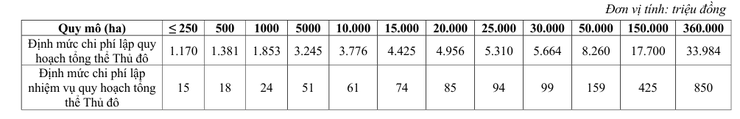 Định mức chi phí cho việc lập Nhiệm vụ quy hoạch, Quy hoạch tổng thể Thủ đô được quy định: (1) Chi phí lập Nhiệm vụ quy hoạch, Quy hoạch tổng thể Thủ đô xác định bằng định mức chi phí tại Bảng số 1 Phụ lục I kèm theo Quyết định này.