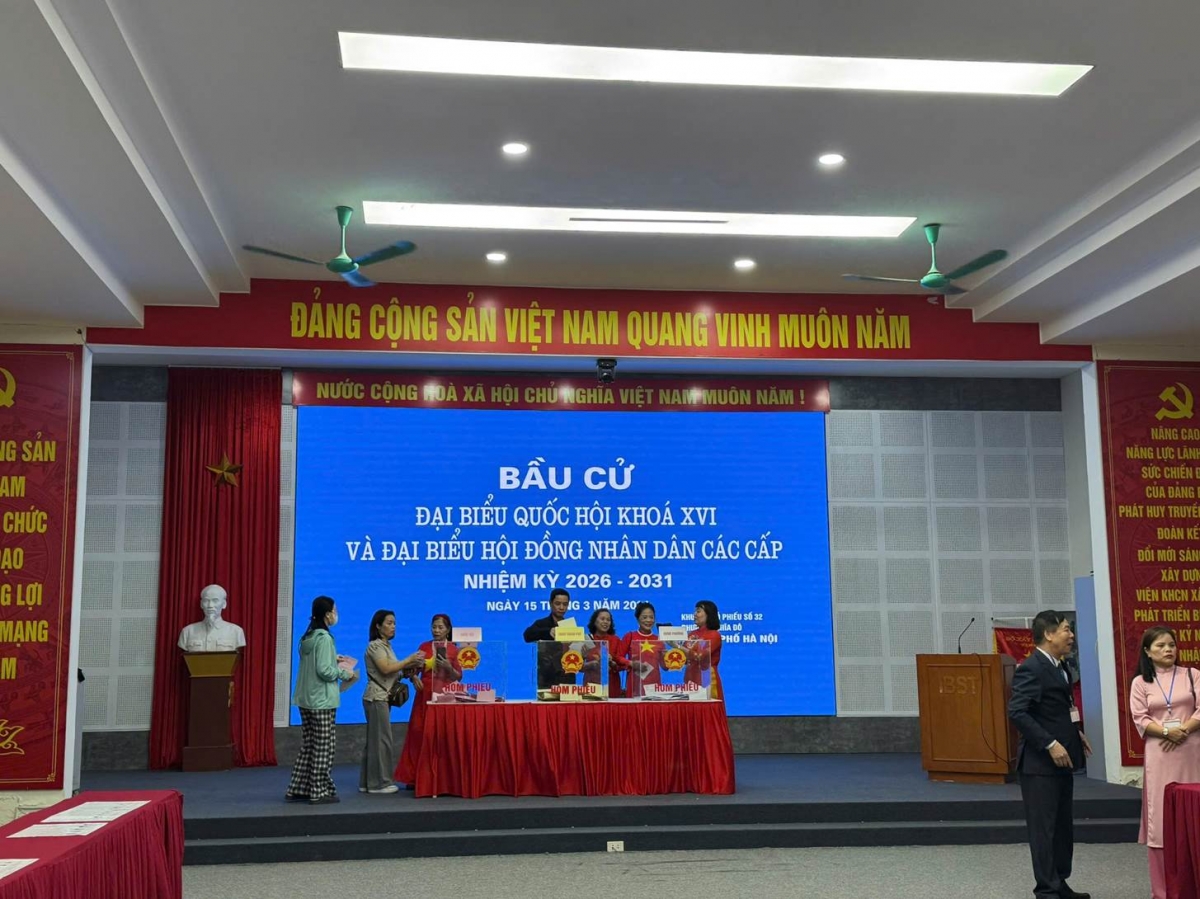 Các cử tri tại khu vực bỏ phiếu số 32, phường Nghĩa Đô, thành phố Hà Nội bỏ phiếu bầu cử đại biểu Quốc hội khóa XVI và đại biểu Hội đồng nhân dân các cấp nhiệm kỳ 2026 - 2031.